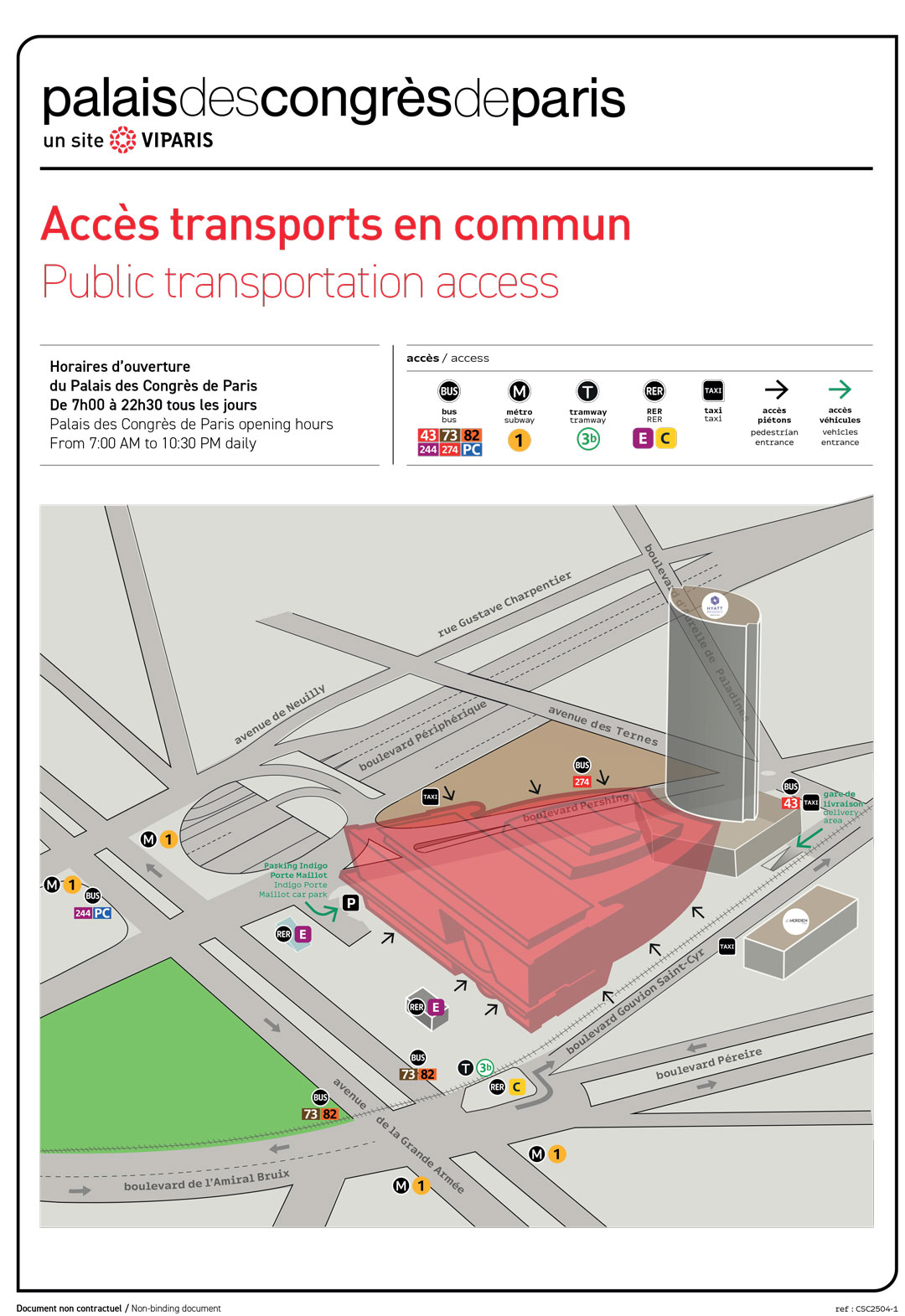 Lieu du congrèsPalais des Congrès Porte Maillot2, place de la Porte Maillot75017 ParisL’accueil est localisé au niveau 2Les salles sont réparties sur les niveaux 2 et 3Comment vous y rendre ?Liaison directe avec l’aéroport Charles de Gaulle : 30 minutes, navette toutes les 12 minutesVOITURE : boulevard Périphérique : accès direct Porte MaillotMETRO :Ligne 1, Station Porte Maillot – sortie 3RER :Ligne C, Station Neuilly – Porte Maillot |Ligne E, Station Neuilly – Porte MaillotTRAMWAY :Ligne T3b, Station Porte MaillotBUS :Lignes 43, 73, 82, 244, PC Accès Transports Accès parking Infos accès PMR